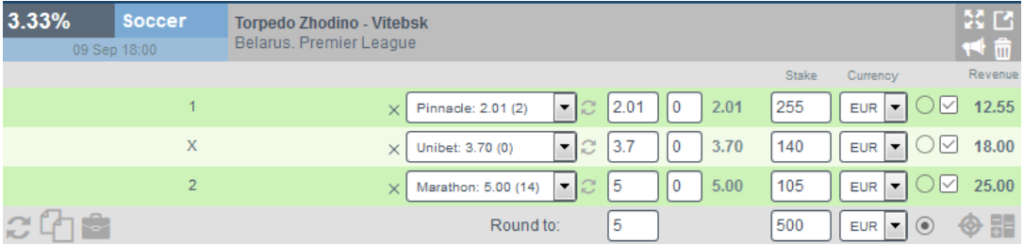 We distribute our $500 as follows: $255 pinnacle for a Torpedo Zhodino win, $140 Unibet for a draw, and $105 for a Vitebsk win.